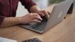 Close-up of male hands typing on a laptop keyboard in an office setting