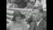 Pan of the Harry F. Knight House in St. Louis / WS the structure seen through gates as a man uses a rake to tidy the dirt driveway / A long line of cars drive past / Airships flying high above / VS a crowd standing at a building decorated with bunting; Charles Lindbergh rides in a car decorated with white paper and a model of "The Spirit of St Louis"; mayor Victor J. Miller sits at his left; motorcycle police escort the procession / Several shots of the parade route and marching soldiers and sailors carrying American flags / The street is littered with papers and ticker tape // A marching band at Sportsman's Park baseball field; Lindbergh, in a fedora, walks past with local dignitaries, including Miller at his right; players of the St. Louis Cardinals baseball team walk by; Lindbergh and another raise the pennant for the world champion Cardinals, winners of the 1926 World Series / He accepts small gifts from Baseball Commissioner Kenesaw Mountain Landis and shakes hand of player-manager Bob O'Farrell as umpire Charlie Moran looks on / Right profile of Lindbergh and he chats with woman who might be his mother, Evangeline Lindbergh