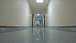 Point of view low angle shot of a patient on stretcher being transported down the hospital hallway by the medical team.