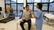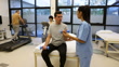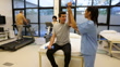 Physical therapist guiding a man doing exercises using weights at a rehabilitation center - Incidental patients working out at background