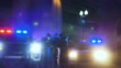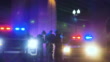 Rear view of two multiracial police officers arresting a criminal suspect, with his hands handcuffed behind his back. One of the officers is an African-American man and the other is a policewoman, both in their 40s. It is nighttime, and they standing between two police cars with emergency lights on.