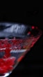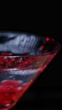 Pomegranate seeds are falling into martini glass. Slow motion