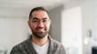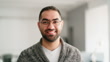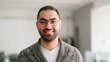 Portrait of confident young businessman standing in startup office. Successful male professional looking at camera and smiling at coworking office space.