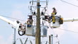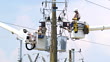 Electrical workers in bucket trucks.