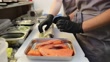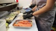 Side view close-up of an unrecognizable person rolling up and preparing sushi in the kitchen of a sushi bar.