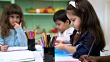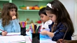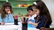 Cute girl holding in book while sitting amidst friends at desk. Preschool students are drawing in books at classroom. They are coloring in school building.