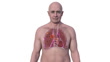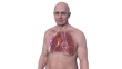 Rotating animation of a man's thoracic (chest) cavity revealing a Ghon complex in the lungs caused by tuberculosis. A Ghon complex is a lesion in the lungs consisting of swollen lymph nodes which contains bacteria. Tuberculosis is a bacterial infection of the lungs. It can be serious if left untreated but antibiotics typically resolve the infection