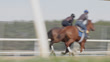 Tight Follow Shot of Two Horse Jockeys Racing Thoroughbred Race Horses in a Training Race Session on a Dirt Track in the Spring - Northeast USA