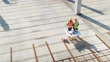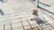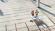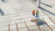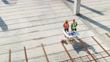 High angle view of construction project manager and foreman wearing hardhats, reflective vests, and having a discussion.