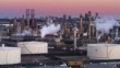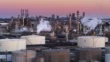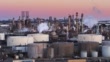 Aerial shot of a steaming oil refinery at dusk in the industrial complex around the Port of Los Angeles.