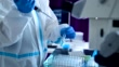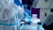 Onderzoeker die virusonderzoek doet. Het dragen van een beschermend pak. - 4K Stockvideo
