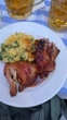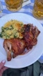 Roasted chicken with potato salad and beer on a restaurant table