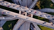 Top down drone shot of layers of freeway overpasses at the Four Level Interchange, aka the Bill Keene Memorial Interchange, rotating lazily over the circulating traffic.