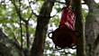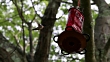 Cranston, Rhode Island - June 26, 2016: A ruby-throated hummingbird hovers while drinking from an antique style glass feeder against a bokeh background and then shoot up through the trees.