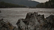 Shot of a running stream and a rocky shore in the Altai Mountains.