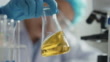 Scientist hands in gloves hold sterile flask with yellow liquid