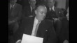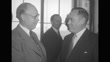 US Senator Robert A. Taft on right standing next to Senator John W. Bricker and talking with him / two shots of Taft standing next to Senator Leverett Saltonstall, shaking his hand and talking with him / three shots of members of Republican Senate caucus sitting around long table for caucus meeting, Taft standing at head of table / Taft hitting gavel on table to call meeting to order / two closer shots of Taft and Senator Eugene Milliken sitting together at table looking at document and talking / two shots of Bridges and Senator William Knowland sitting together at table looking at document and talking / Senator Homer S. Ferguson on right and other Senator sitting together at table looking at document and talking / close shot of Senator James H. Duff / Senators sitting at table / indistinct shot / three shots of Bridges shaking hands with other Senators / two shots of Taft and Bridges shaking hands and talking / Bridges shaking hands with Milliken / two shots of Taft, Senator Henry Cabot Lodge, Jr., and Bridges standing together posing for photo opportunity and shaking hands / close shot of Bridges posing for photo opportunity / Bridges and Milliken shaking hands / Note: exact day not known