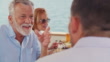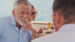 Slow motion medium shot of a senior man talking to his son on his yacht while sitting at the table and having lunch with the family. Shot in Croatia.