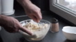 senior man uses cinnamon. Close-up, senior man cooking a healthy meal at kitchen. face is not visible. casserole