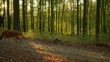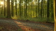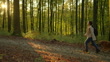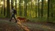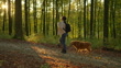 Side view of young woman walking with golden retriever dog on dirt road in autumn forest during daytime. Fallen leaves cover the ground, creating a colorful seasonal atmosphere. Sunlight filters through trees, adding warmth to the peaceful scene as they walk together through the serene woods.