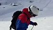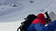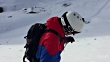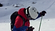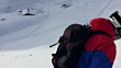 Skier getting ready to ride powder snow. An extreme backcountry skier is preparing to ski down the hill through deep snow. He wears an avalanche airbag because of the freshly fallen snow, as well as a ski helmet, goggles and an avalanche transceiver. Shot in slow motion.