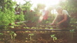 Water conservation and food security. Family working in vegetable garden with sunset light behind. They are watering the plants and plowing the land.