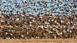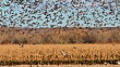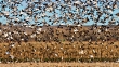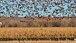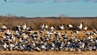 Snow Geese (Anser caerulescens), Ross’s Geese (Anser rossii), and several duck species (primarily Mallards [Anas platyrhynchos]) over Bosque del Apache National Wildlife Refuge on the Rio Grande in New Mexico.