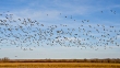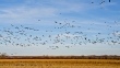 Snow Geese (Anser caerulescens), Ross’s Geese (Anser rossii), and several duck species (primarily Mallards [Anas platyrhynchos]) over Bosque del Apache National Wildlife Refuge on the Rio Grande in New Mexico.