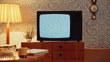 Medium dolly shot of a living room and an old tv set with noise on the screen. Shot in Slovenia.