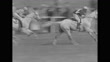 Title card: "Society Sees Jump Stars in Hunt Classic" / "Roslyn, NY" over a large group of people / People seated atop a vehicle / Mrs. Cornelius (Gwladys) Whitney with binoculars / CU young Gloria Vanderbilt / jockey and saddle at weigh-in / jockey Charles White mounts his horse / VS horses racing in the distance / they jump hedge; one horse and its jockey fall / a closer view of the spill / VS the horses; two white horses battle it out and St. Francis beats Hurry Harry