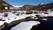 A woman in a red kayak paddles on a slow moving river during the spring runoff in the mountains as the snow melts in Colorado, and a woman cross country skier skis in the spring snow.