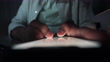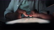 Man using his smartphone late in night. He is typing a message or browsing internet. Close up scene.