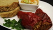 Tasty peppers stuffed with rice, vegetables, bread and salad