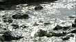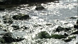 Sunlight reflects on a stream flowing over rocks.