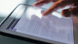 Extreme close up dolly shot of mature man's hand operating a computer tablet (tablet computer). Canon 5D 85mm macro lens.