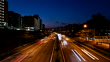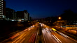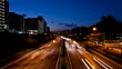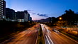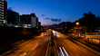 Time Lapse clip of traffic scene in twilight at Tampines Express Way from high angle view, with Punggol housing estate in background, Singapore.