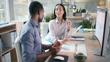 Tech workers, conversation and planning with tablet and computer info for a web design project. Teamwork, collaboration and communication of business people with productivity for online proposal - 4K Stockvideo