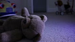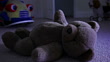 A teddy bear lying on the floor of a child's bedroom late at night with an open door and other toys in the room. Dolly shot.