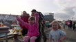 A medium, slow motion, tracking shot of a family with two children enjoying a day out together in Beadnell, North East England. They are moving past the harbour and the father is running while pushing his daughter who is a wheelchair user. They all look excited and the young girl has her arms in the air.
