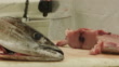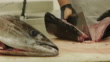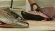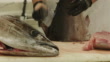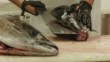 Steady shot of a butcher cutting chunks of albacore tuna, also known as longfin tuna, at a tuna processing plant in Catania, Sicily, Italy.