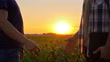 SLO MO Two farmers shake hands in the field of corn at sunset - 4K Stockvideo