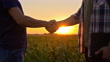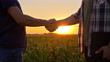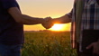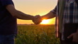 Slow motion low section shot of two farmers shake hands in the middle of the field of corn at sunset.