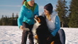 Slow motion shot of the scenario of two women having fun taking selfies with their dog in the snowy terrain . Footage was taken in 8K resolution.