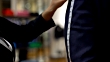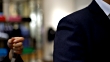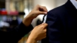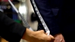Close up of unrecognizable tailor measuring the at length of the suit of a customer