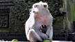 A female wild Macaque monkey sits in Ubud city street with her newborn baby. She is holding the infant close. The location is the outskirts of Ubud, Bali, Indonesia.