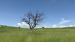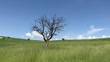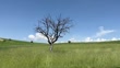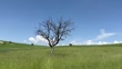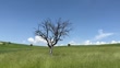 video footage of single tree withered in barley field. Taken in windy daylight.