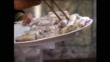 Sequence showing Vietnamese spring rolls (Nem Ran) being picked up off a plate with chopsticks and placed into a wok for deep frying; 1989. (EFEK001J - AEVZ001J)
