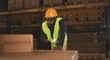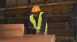 Warehouse worker scanning barcodes on boxes. He is wearing a safety vest and helmet. The warehouse is full of boxes.