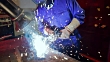 A man is welding in the engineering workshop. He is wearing a welding mask and sparks can be seen.