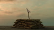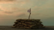 white flag behind military sand bags against sullen sky